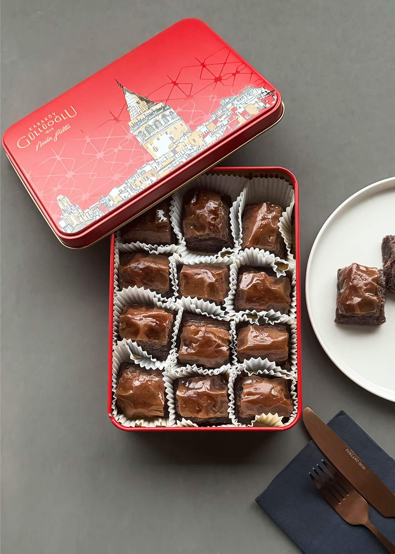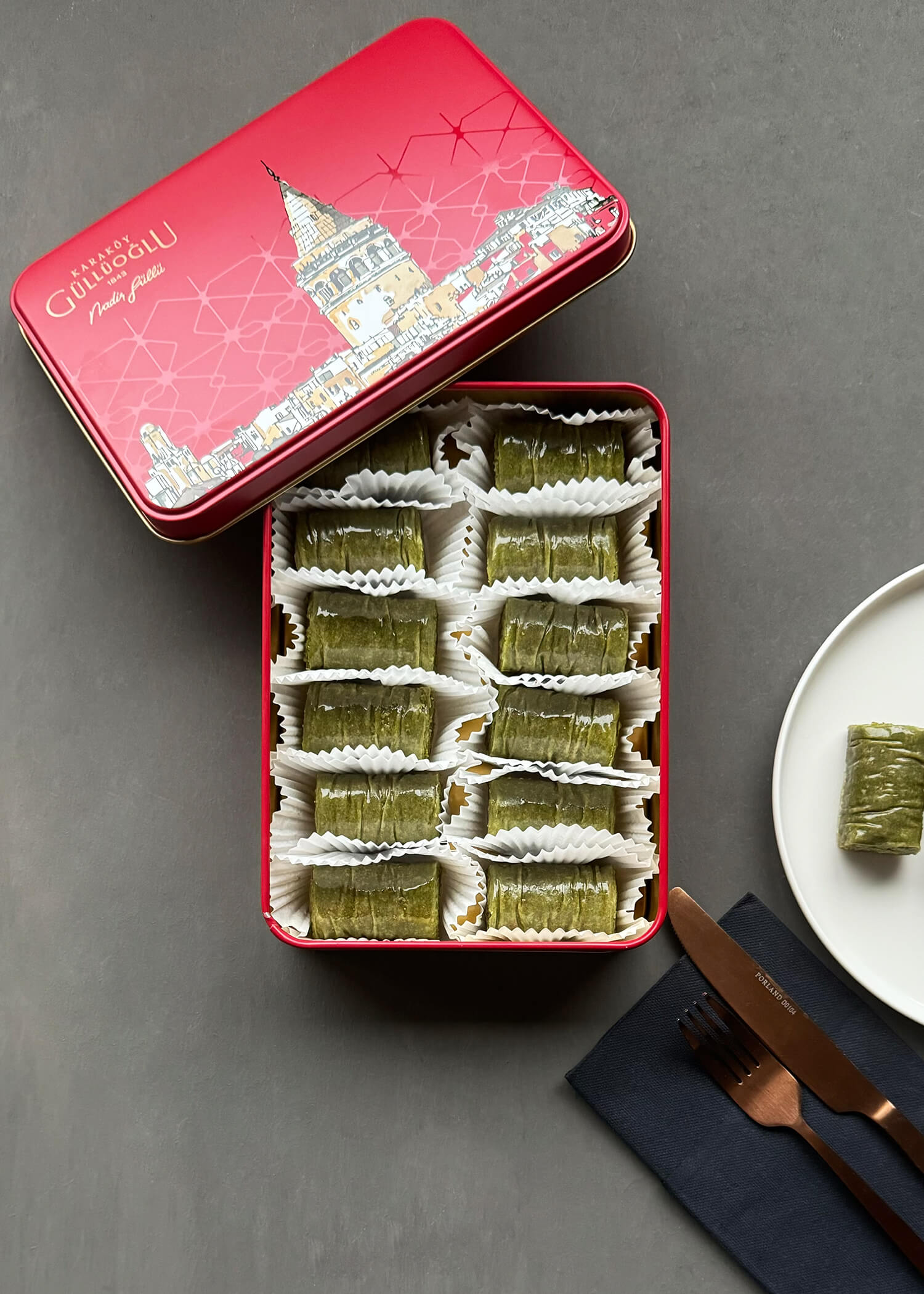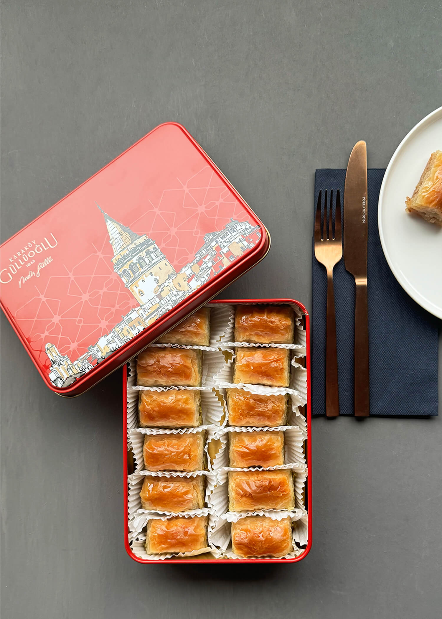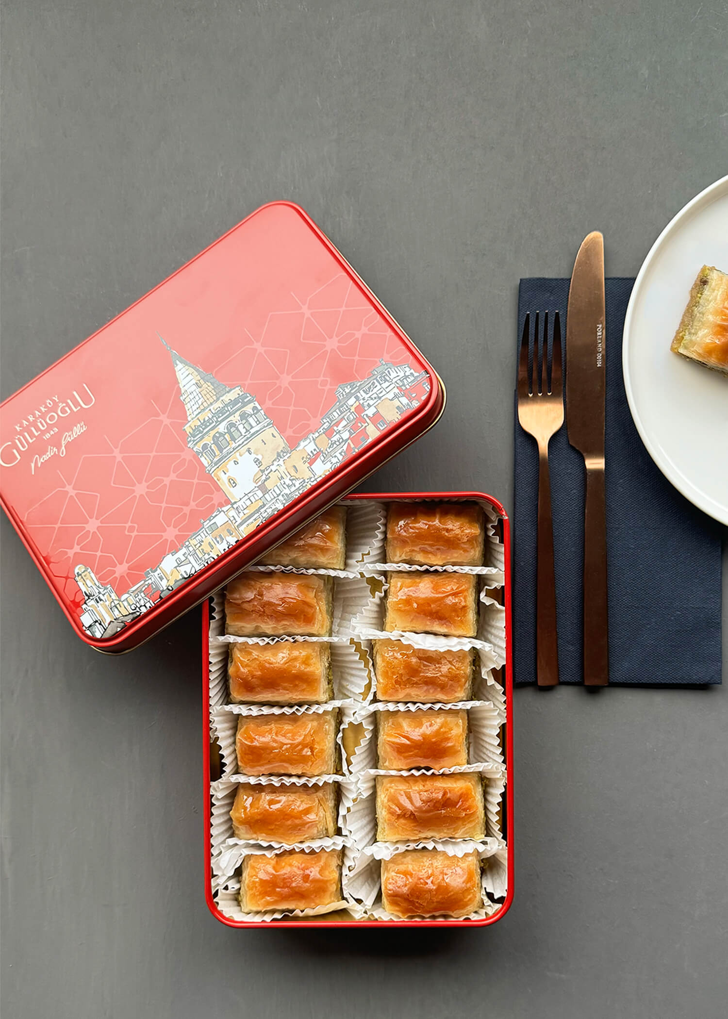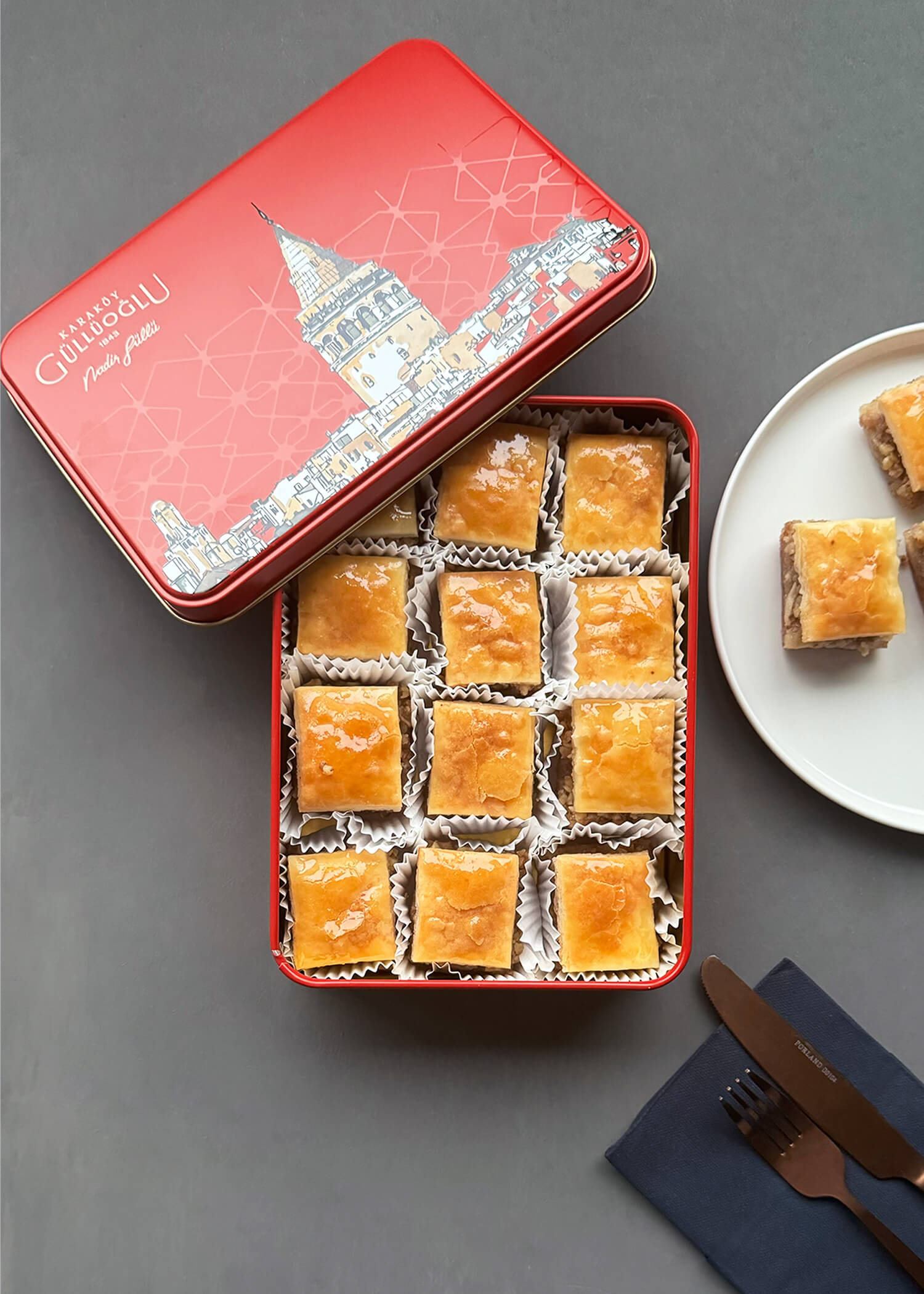 Verschenken Sie Baklava an Ihre Lieben in einer speziell gestalteten Metallbox. Sie können 12 Baklava-Scheiben in die Metallbox legen. Eine schöne Erinnerung und ein köstliches Geschenk.