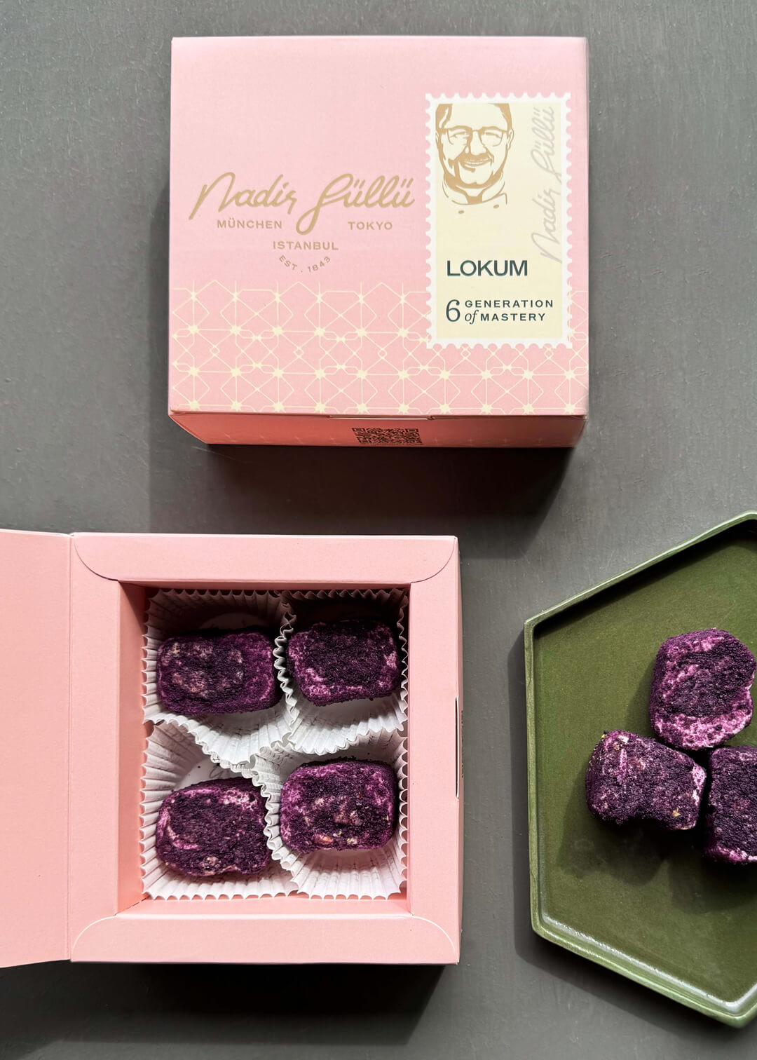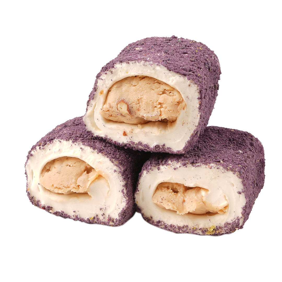 Die Füllung, die aus der einzigartigen Kombination von Haselnusscreme und Mandeln besteht, wird mit der samtigen Textur von Purple Velvet umhüllt. Die besondere Konsistenz und der Geschmack von Purple Velvet machen dieses Lokum einzigartig.