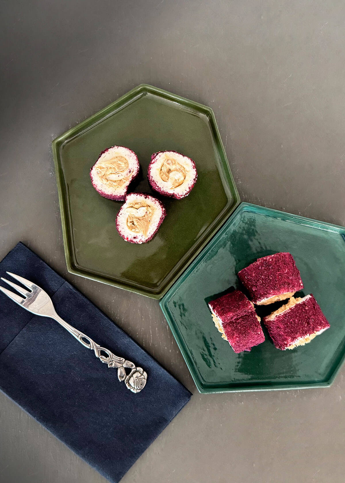 Lokum mit Haselnusscreme und Mandeln, umhüllt mit purple Velvet