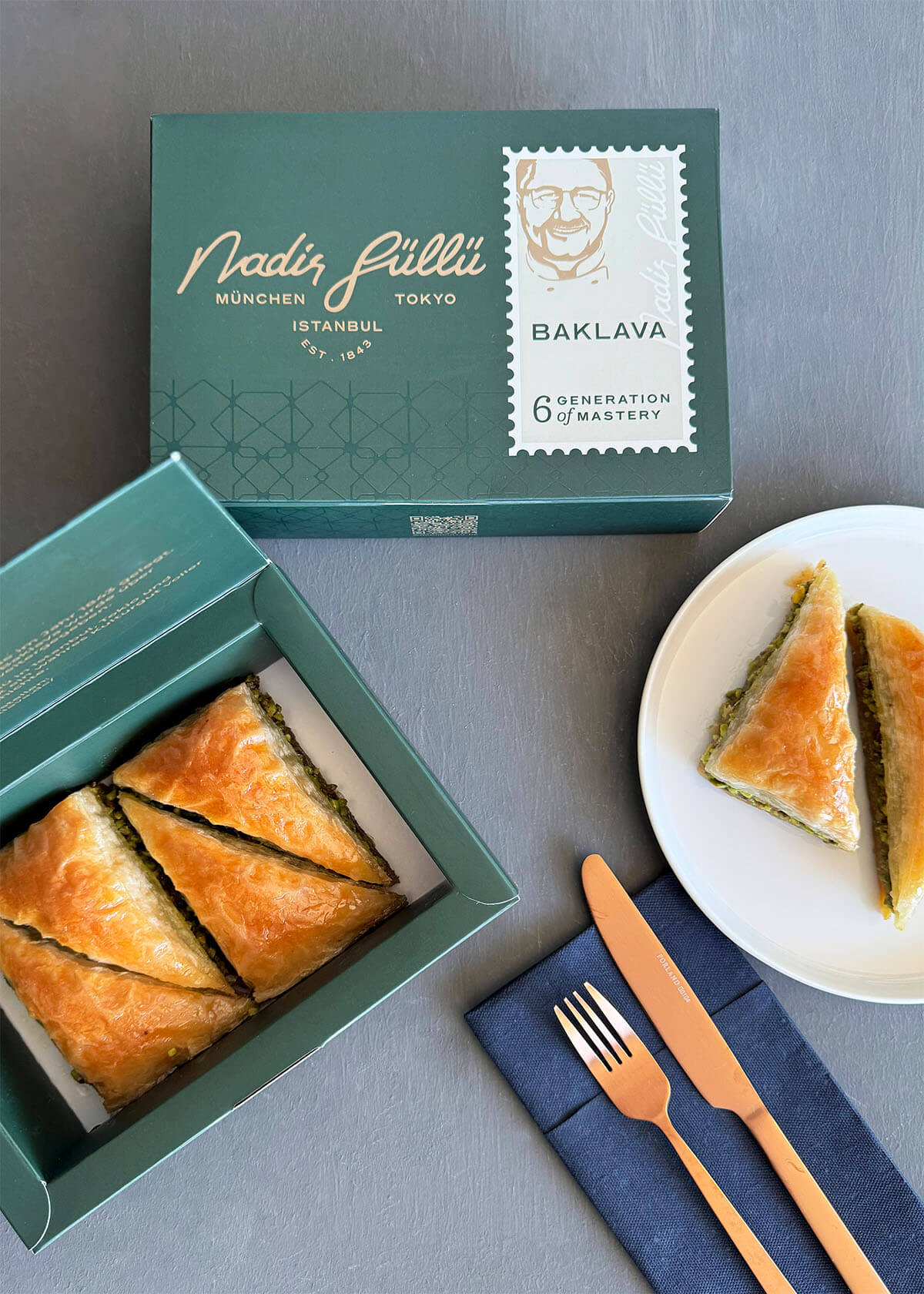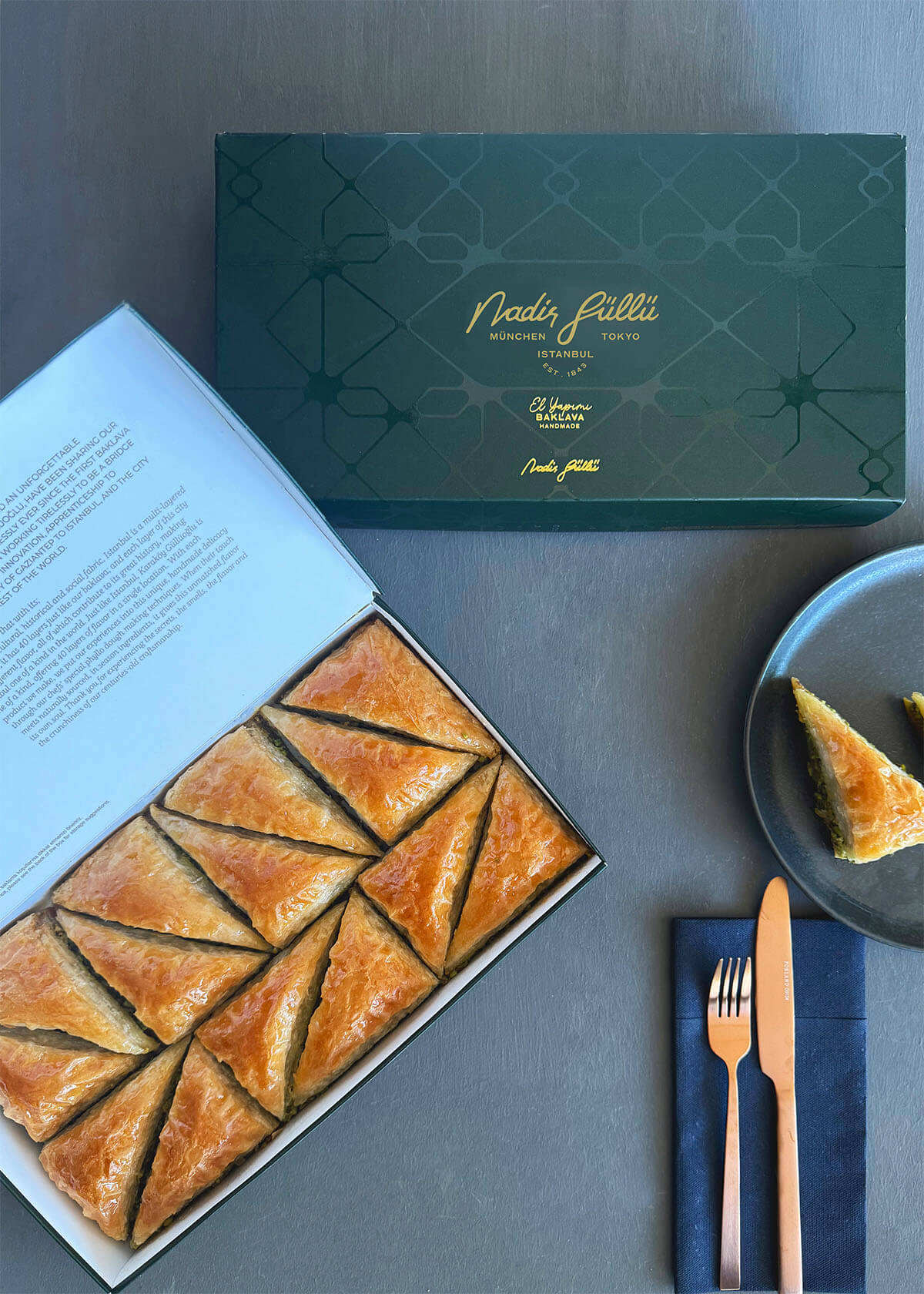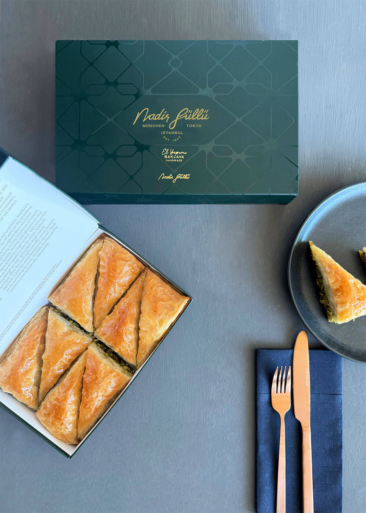 Mit reichlich Antep-Pistazien gefüllt, wird dieses Pistazien-Dreieck-Baklava in größeren und sättigenderen Portionen als klassische Stücke serviert. In der meisterhaften Rezeptur von Nadir Güllü hebt es sich durch die reichhaltige Pistazienfüllung klar von der traditionellen Variante ab. Zudem wird bei der Zubereitung weniger Sirup verwendet, wodurch ein ausgewogener und leichter Genuss entsteht.
