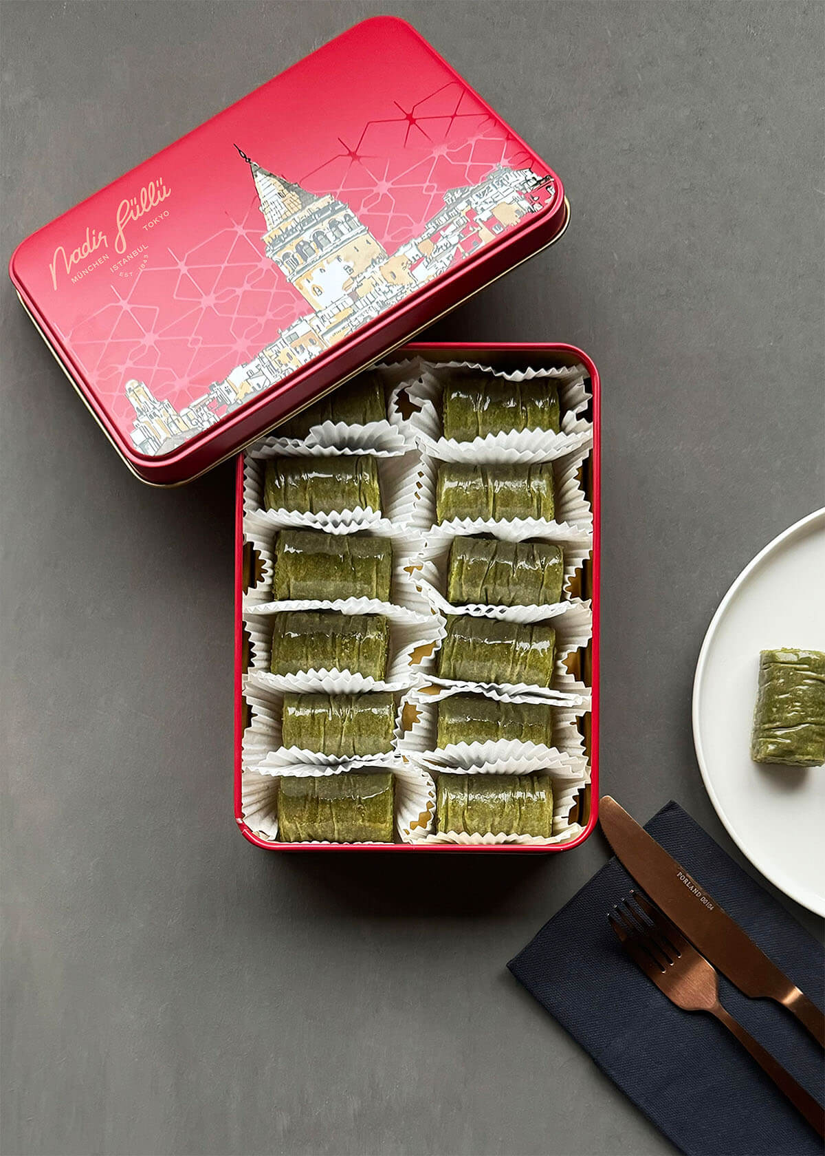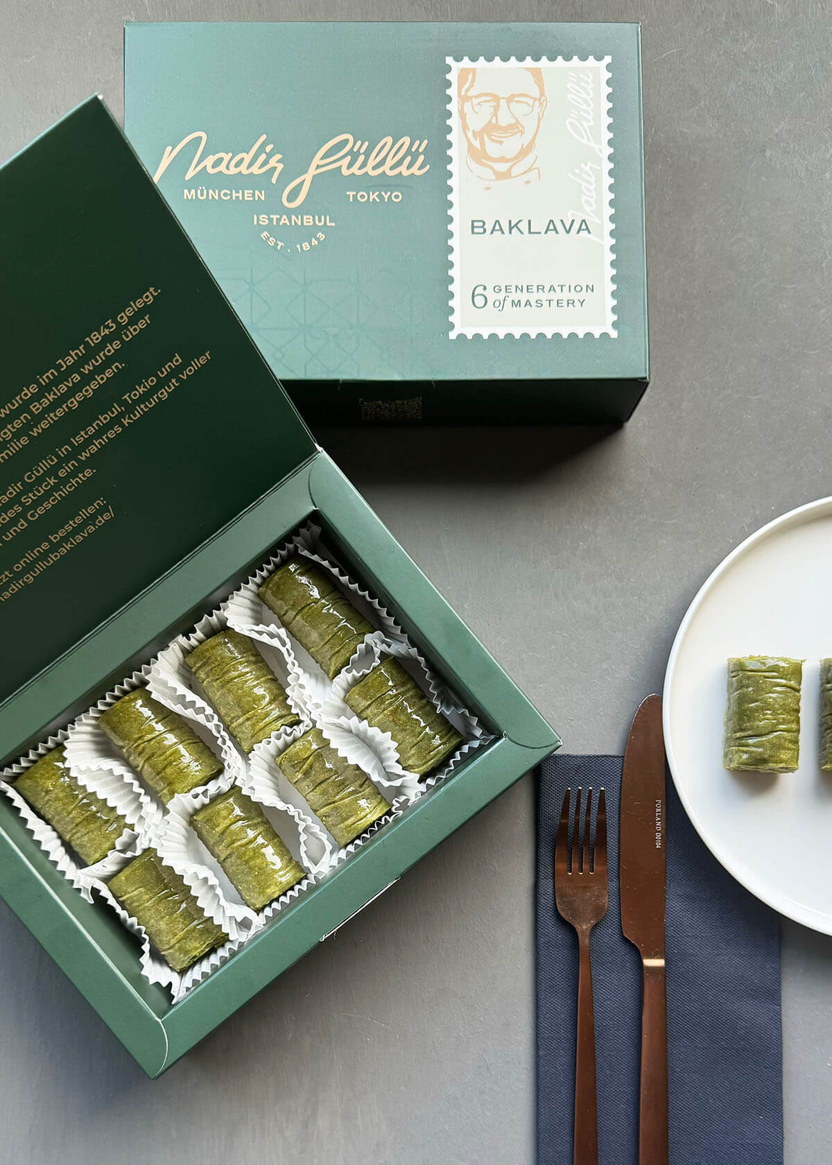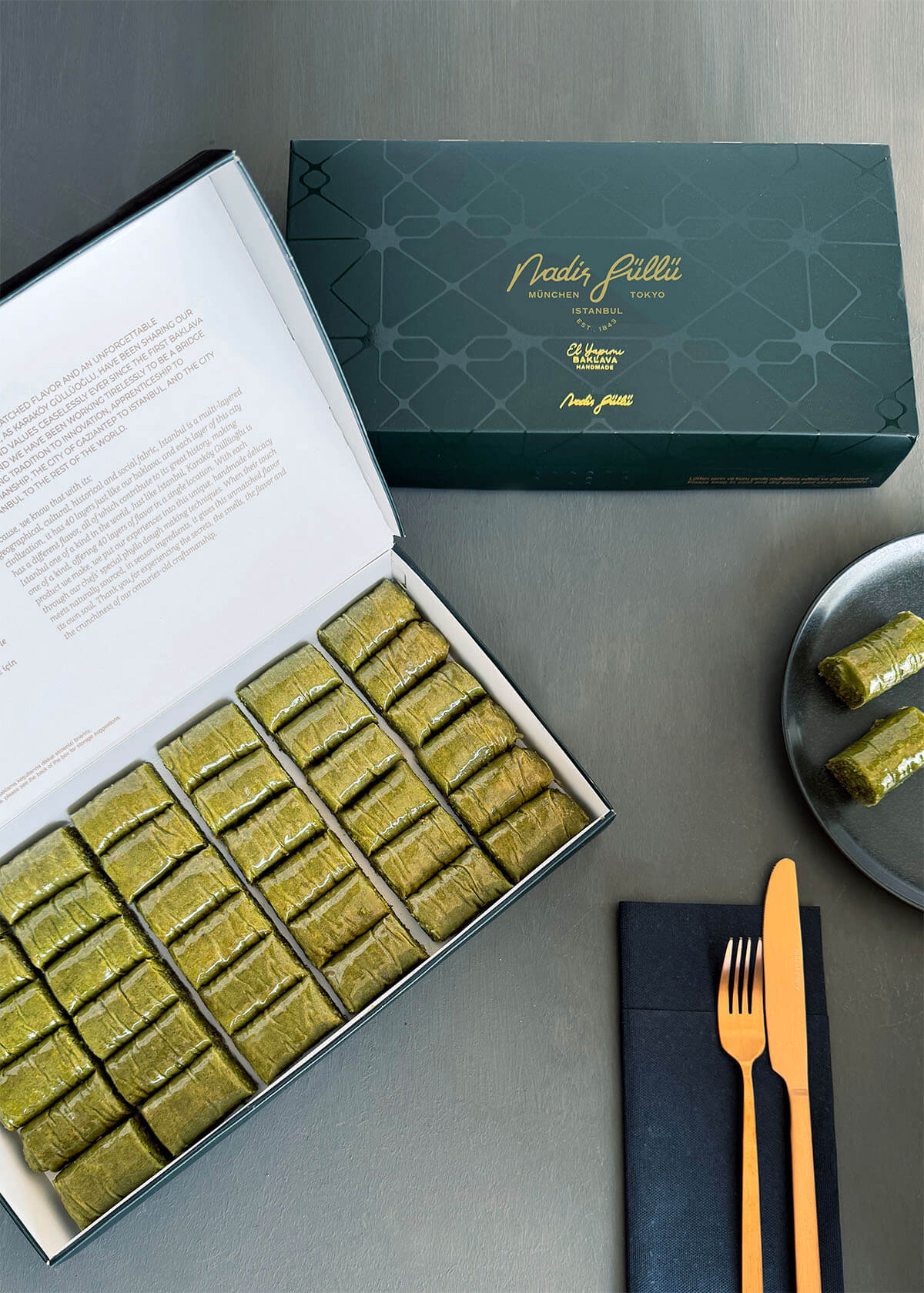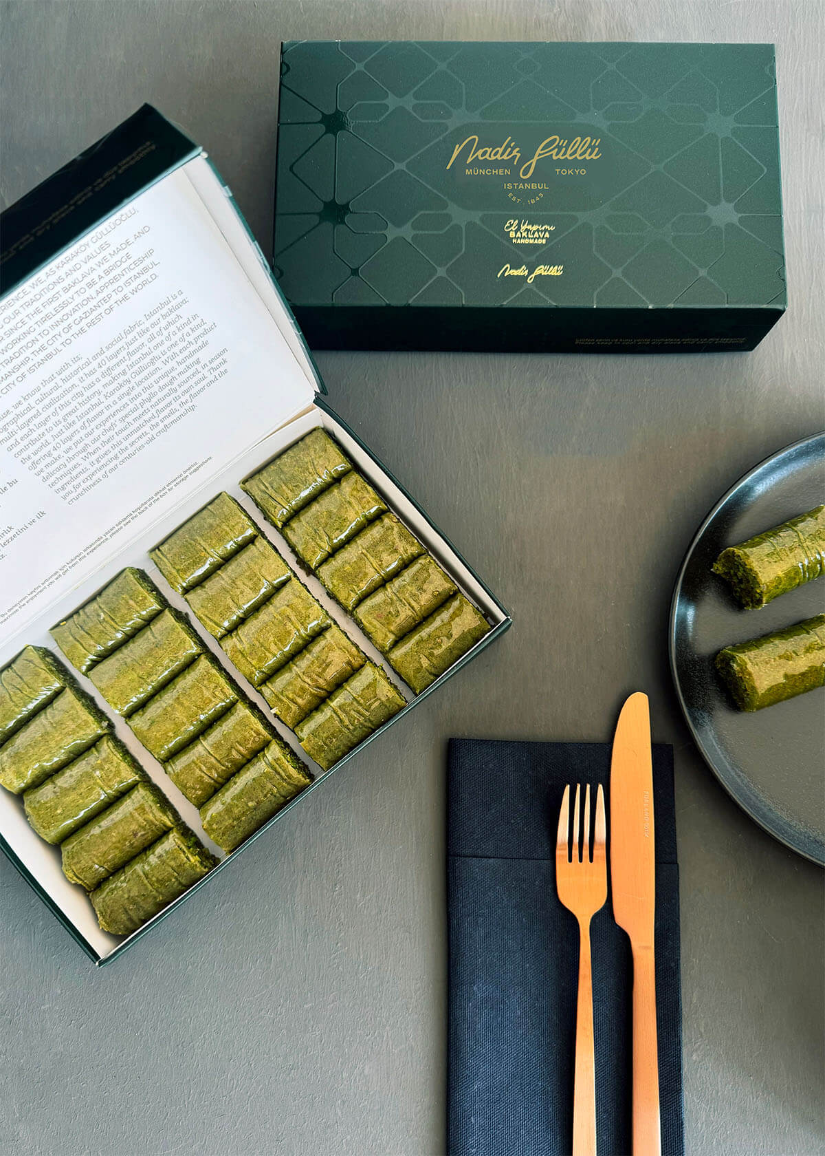 Die von Nadir Güllü meisterhaft zubereitete Pistazienrolle ist mit ihrem eleganten Aussehen und intensiven Geschmack eines der beliebtesten Desserts unter den Naschkatzen. In der Zubereitung wird nur eine einzelne Schicht Teig verwendet, und 90 % des Desserts bestehen aus den hochwertigen Pistazien aus Gaziantep, was jedes Stück zu einem reinen Pistazienerlebnis macht.