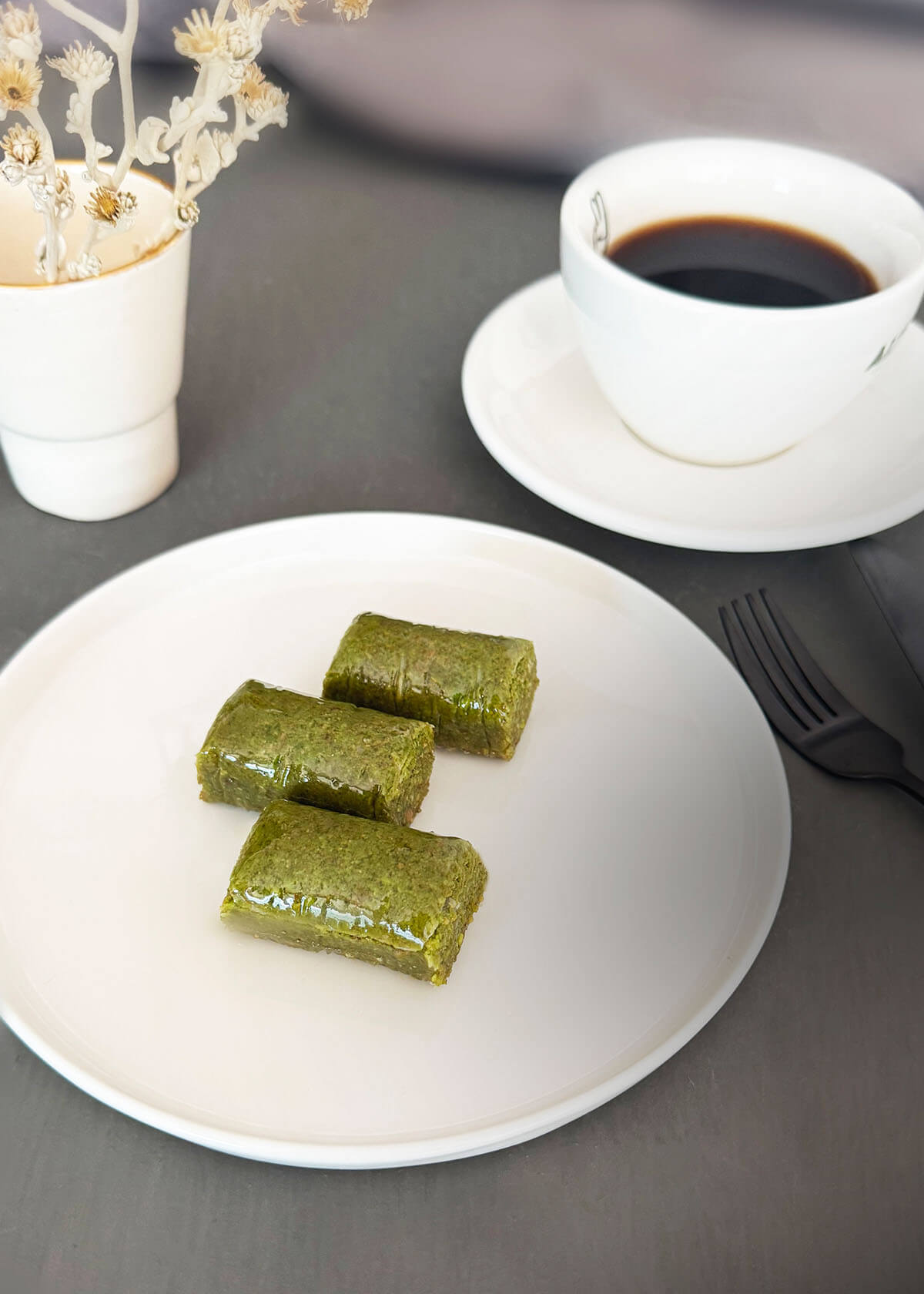 Die Pistazienrolle, die ihren festen Platz in den Theken gefunden hat, ist besonders bei Liebhabern von intensiven Pistaziengeschmäckern sehr gefragt. Dieses köstliche Dessert, das mit minimalem Teig und reichlich Pistazien zubereitet wird, ist sowohl ein Highlight bei besonderen Anlässen als auch ein Genuss für den Alltag!