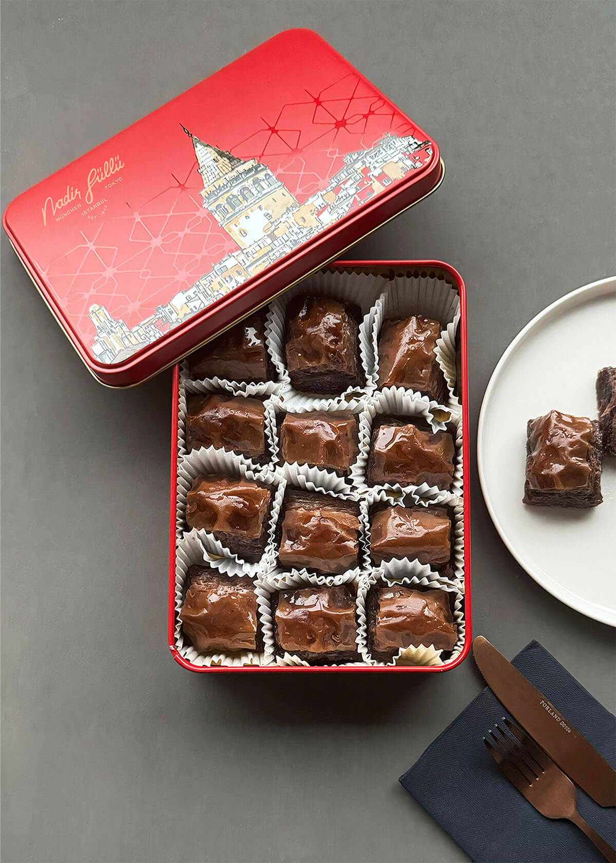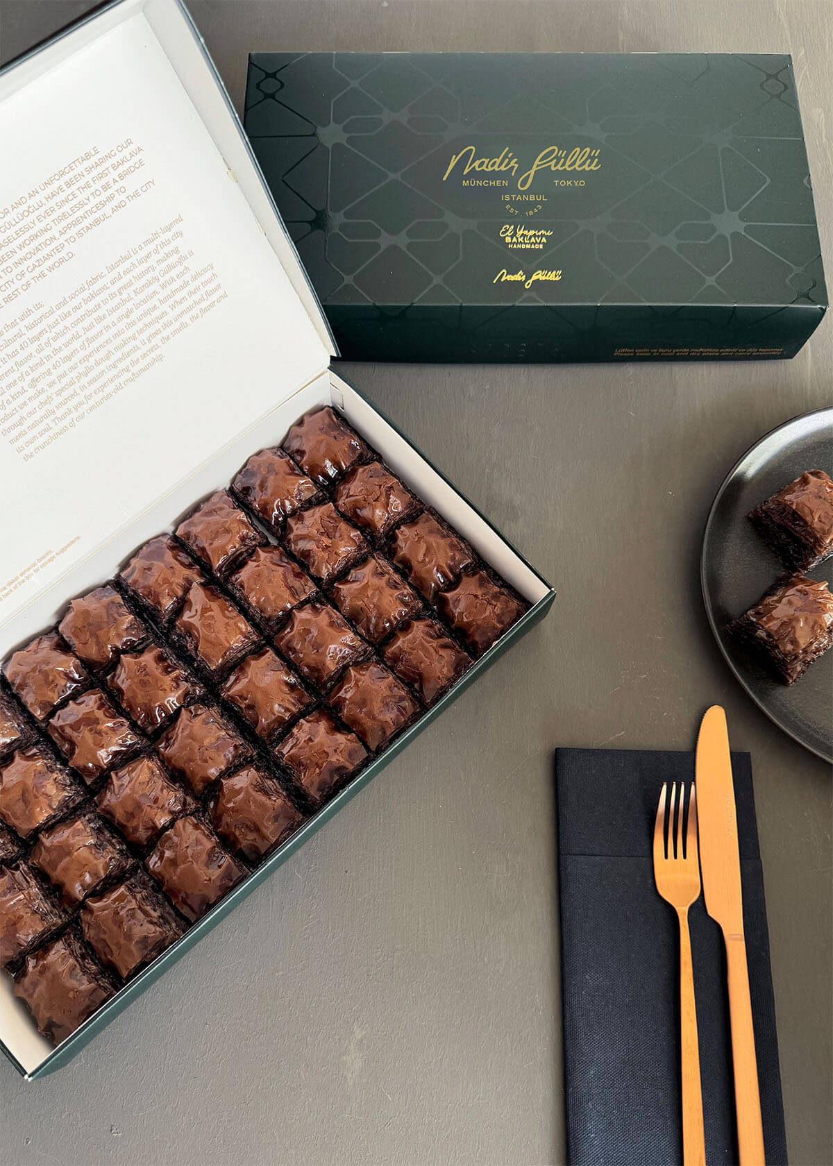 Das speziell für Schokoladenliebhaber kreierte Schokoladen-Baklava von Nadir Güllü wird mit meisterhafter Präzision zubereitet und bietet Süßwarenfans ein unvergleichliches Geschmackserlebnis. Mit jedem Bissen werden Sie den reichen Schokoladengeschmack schmecken. Dieses besondere Baklava erhält ihre unverwechselbare Form durch die kunstvolle Zubereitung der hauchdünnen Baklava-Teigschichten.