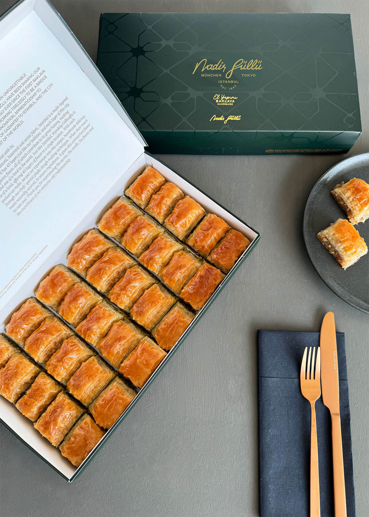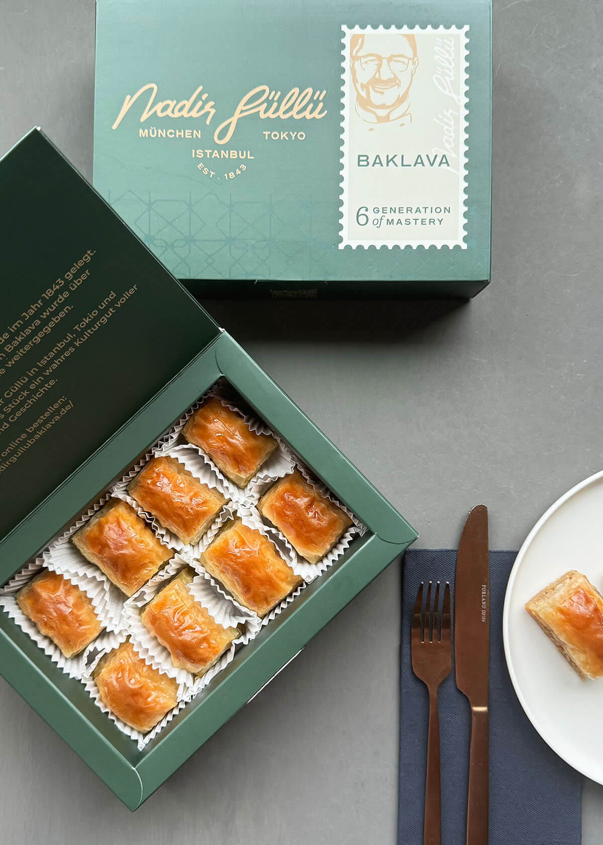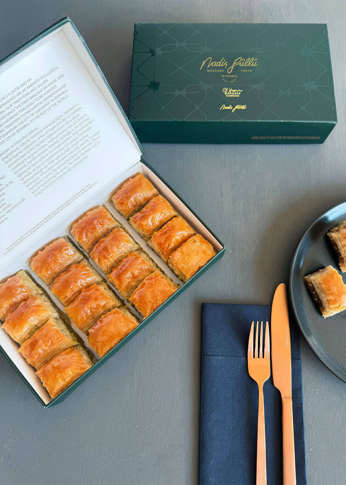 Zwischen sorgfältig ausgezogenen 40 hauchdünnen Teigschichten verstecken sich großzügige Portionen feinster Walnüsse – und verwandeln das Walnuss-Baklava in ein wahres Meisterwerk der Süßkunst. Jedes Stück begleitet unvergessliche Momente – ob zum Tee oder in geselliger Runde mit Ihren Liebsten.
