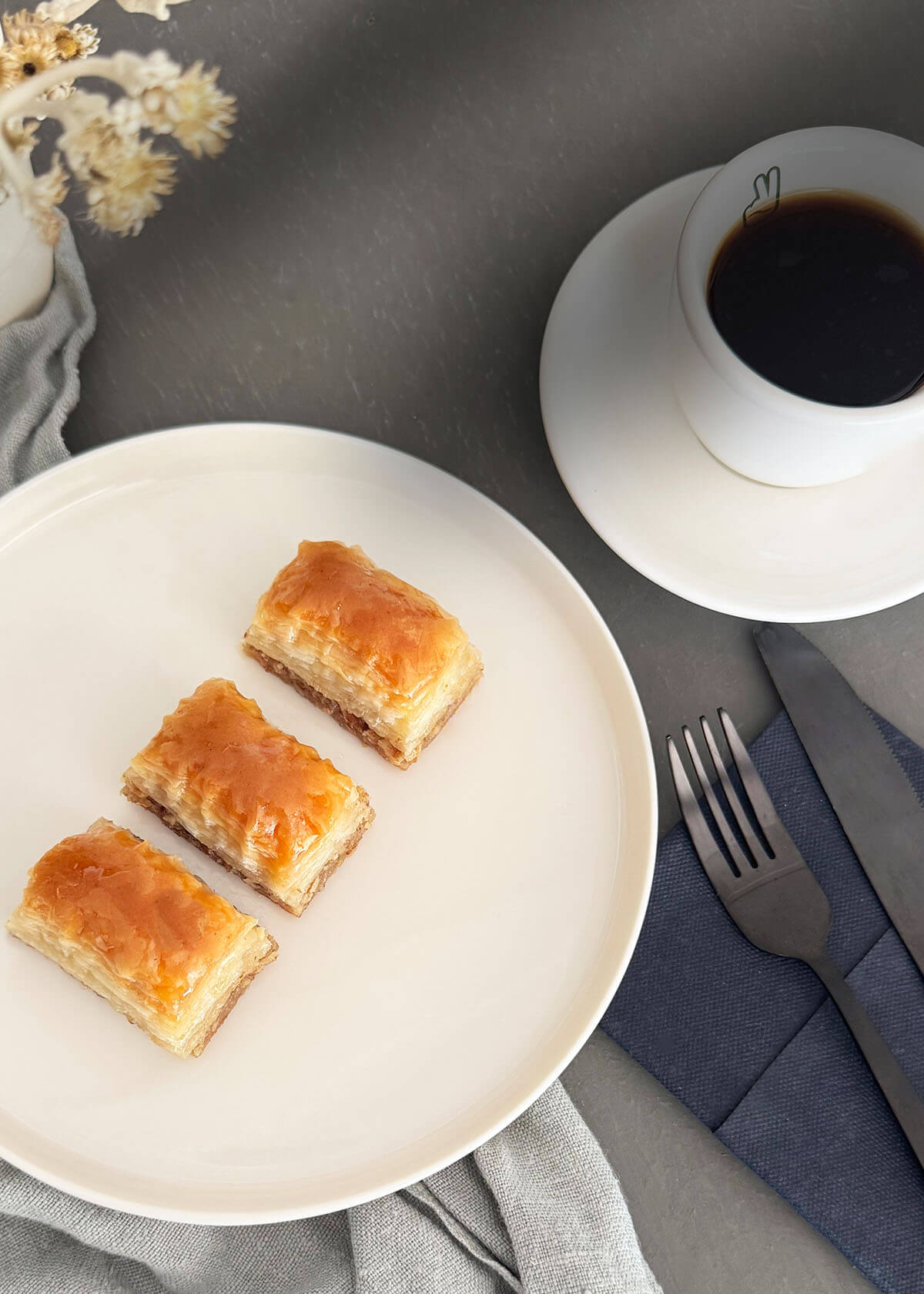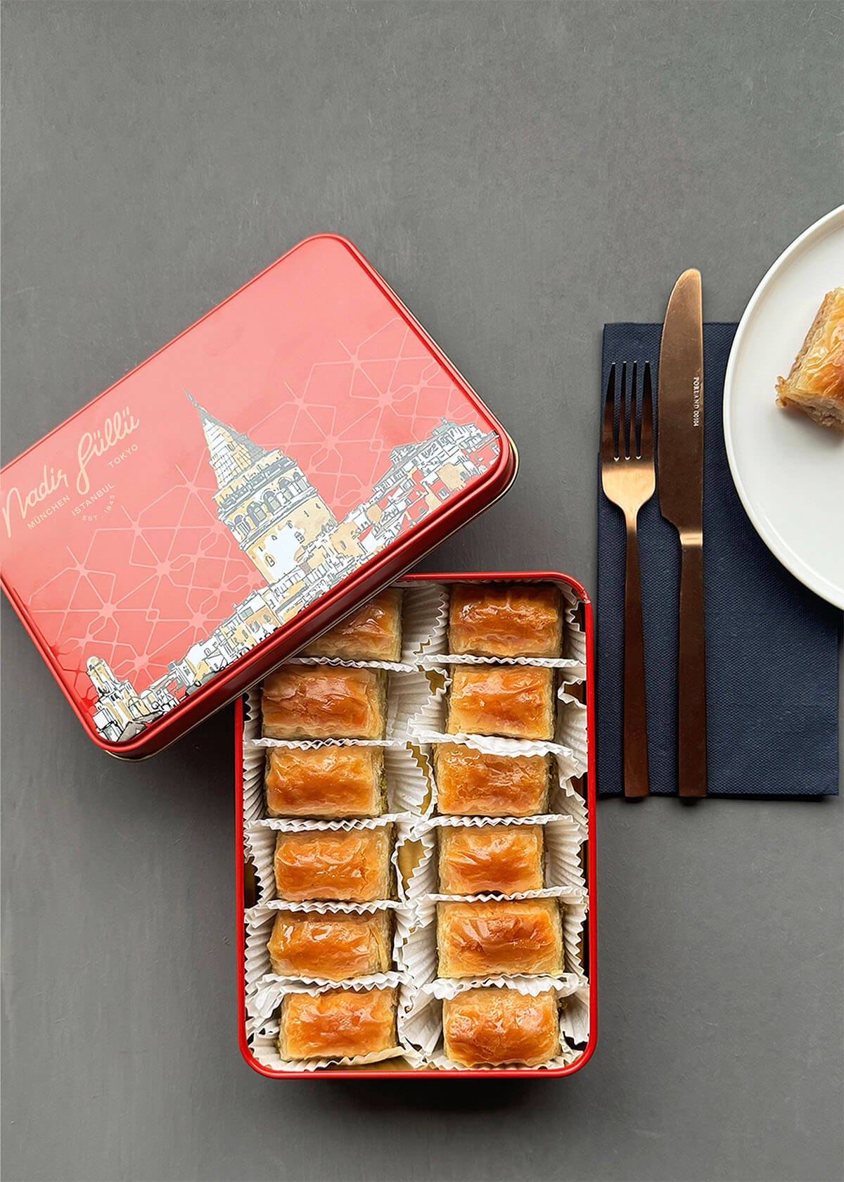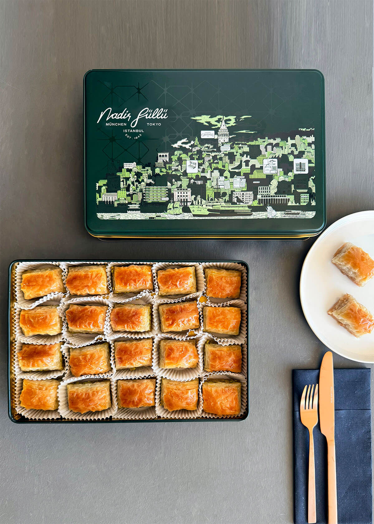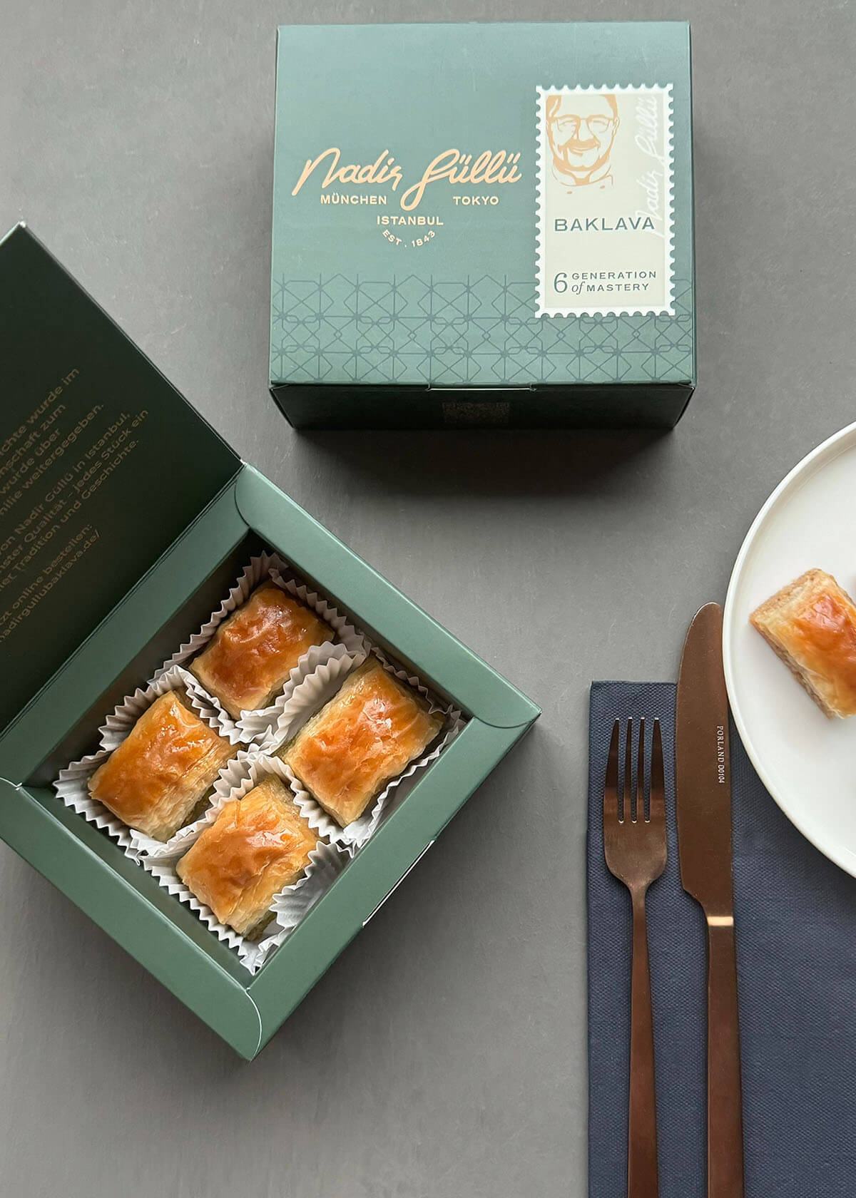 Zwischen sorgfältig ausgezogenen 40 hauchdünnen Teigschichten verstecken sich großzügige Portionen feinster Walnüsse – und verwandeln das Walnuss-Baklava in ein wahres Meisterwerk der Süßkunst. Jedes Stück begleitet unvergessliche Momente – ob zum Tee oder in geselliger Runde mit Ihren Liebsten.